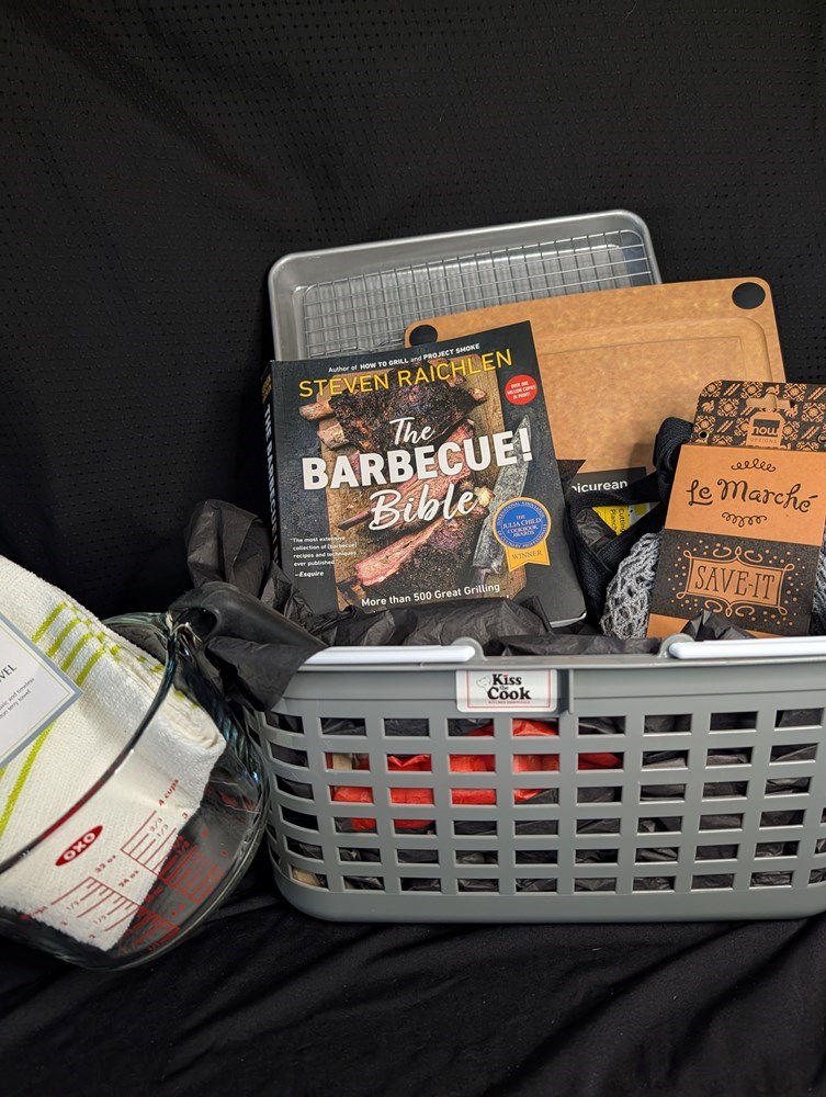 Whip up something delicious with this culinary-inspired basket! Perfect for the home chef or BBQ enthusiast, this bundle includes everything you need to cook, prep, and serve with style. Includes: Half Sheet Pan with Cooling Rack Cutting Board 4-Cup Glass Measuring Cup Assorted Terry Towels Le Marche Net Shopping Bag Steven Raichlen’s The Barbecue Bible Whether you're perfecting a new recipe or firing up the grill, this basket has all the essentials to make every meal a masterpiece. Don’t forget to kiss the cook! Retail Price over $155