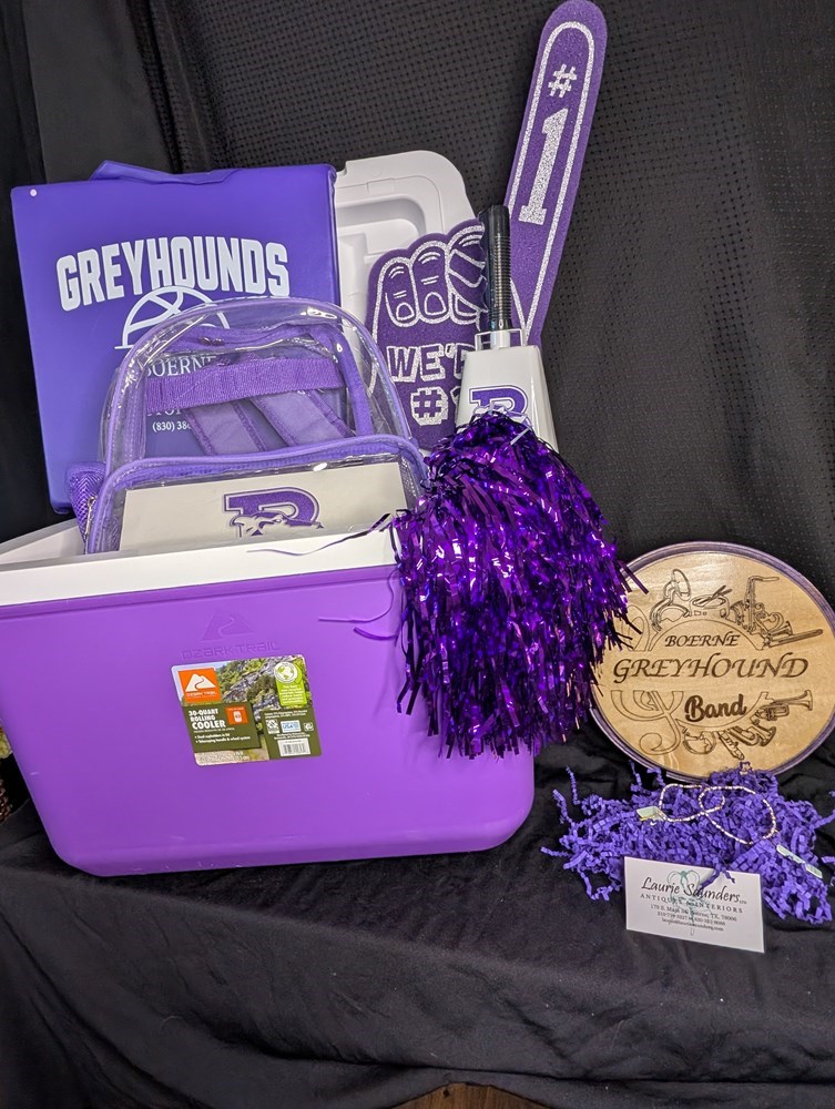 Show off your Greyhound pride with this fun and festive bundle! Packed with purple and white goodies perfect for game days, tailgates, or everyday school spirit. Whether you’re cheering from the stands or relaxing at home, this basket has everything to keep your Boerne pride shining bright! 30 Quart Purple and White Cooler on wheels (2) Enewton Gameday Bracelets (Purple and White) Clear Boerne Greyhound Backpack Boerne Greyhound Foam Finger Boerne Greyhound Cow Bell Small Cheer Pom-Poms Boerne Greyhound Band Wooden Plaque with stand Boerne Greyhound Foam Stadium Cushion