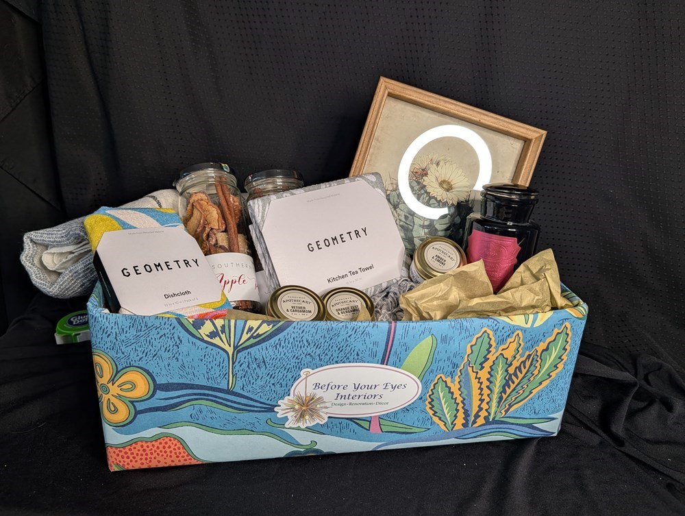 Transform your space with style and comfort! This curated basket from Before Your Eyes Interiors includes everything you need to add warmth, elegance, and cozy charm to your home. Perfect for relaxing evenings, decorating your favorite spaces, or giving your home a fresh, effortless update. Includes: Black Fig 8 oz Candle Apothecary Candle, Tobacco Scent Set of Nine Cactus Flower Prints under Glass Seed Kitchen Tea Towel | Geometry Parade Dishcloth Set | Geometry The Southern Spirit: Apple Pie Cocktail Infusion Chamonix Throw Total Value: $288 Elevate your home décor and enjoy cozy, stylish evenings with this beautiful basket!