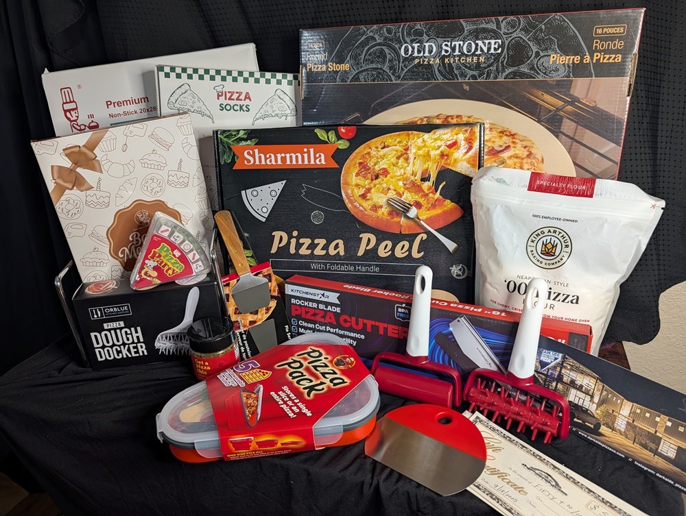Bring the pizzeria to your home with everything you need for the ultimate pizza night! From sauces and seasonings to a pizza stone and fun accessories, this basket has it all. Perfect for pizza lovers of all ages—get ready to roll out the dough, have fun, and enjoy a delicious night in! Includes: $50 Inferno’s Pizza Gift Card $40 Dark Side Pizza Gift Card 16” Round Pizza Stone “Get A Pizza This” Pizza Seasoning Pizza Party Dice Game Pie Server Pizza Dough Docker Pizza Making Kit Pizza Pack Storage Rocker Blade Pizza Cutter Pizza Stand King Arthur ‘00’ Pizza Flour Pizza Socks Pizza Peel Silicone Mat Baking Pastry Mat Rope Storage Basket+ Total Value: $307 Everything you need to make pizza night a slice of heaven—fun, flavorful, and perfect for sharing with friends and family!
