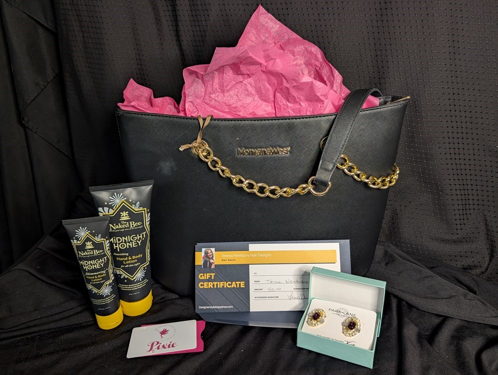 Treat yourself with this self-care and style bundle! Includes: Teresa Newbury Hair Designs $55 Pixie gift card $50 Chic purse Park Lane Stylish earrings Naked Bee uxurious scented lotion Perfect for a day of pampering and retail therapy!