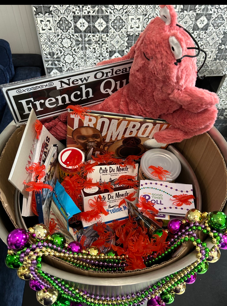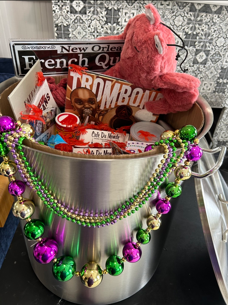 New Orleans Trombones Basket list $124.99 GasOne Stainless Steel Stockpot with Basket 84 Quarts— for crawfish boils, fried turkey, and more! $100 GIFT CARD to Pappadeaux’s Resturant! $50 GIFT CARD to PJ’s Coffee, plus $14.99 King Cake flavored coffee “K-Cup” capsules! $19.42 Cafe du Monde beignet mix & Chicory “Coffee” ground $21.99 Bourbon Street Insulated Tumbler $21.95 Taste of Treme cookbook $15.99 The Best of New Orleans cookbook $14.99 Praline Mix $9.99 Roasted Salted Almonds $4.74 Roasted Salted Pecans $12.49 Slap Ya Mama Cajun Seasoning and Tony Chachere’s Creole Seasoning $8.99 Blue’s Hog Cajun Seasoning $8.22 French Quarter Retro Sign $11.21 Trombone Shorty illustrated children’s book $16.58 Big Plush Crawfish Toy $15.99 Oversized Mardi Gras beads $25 Welcome Doormat Value approximately $475